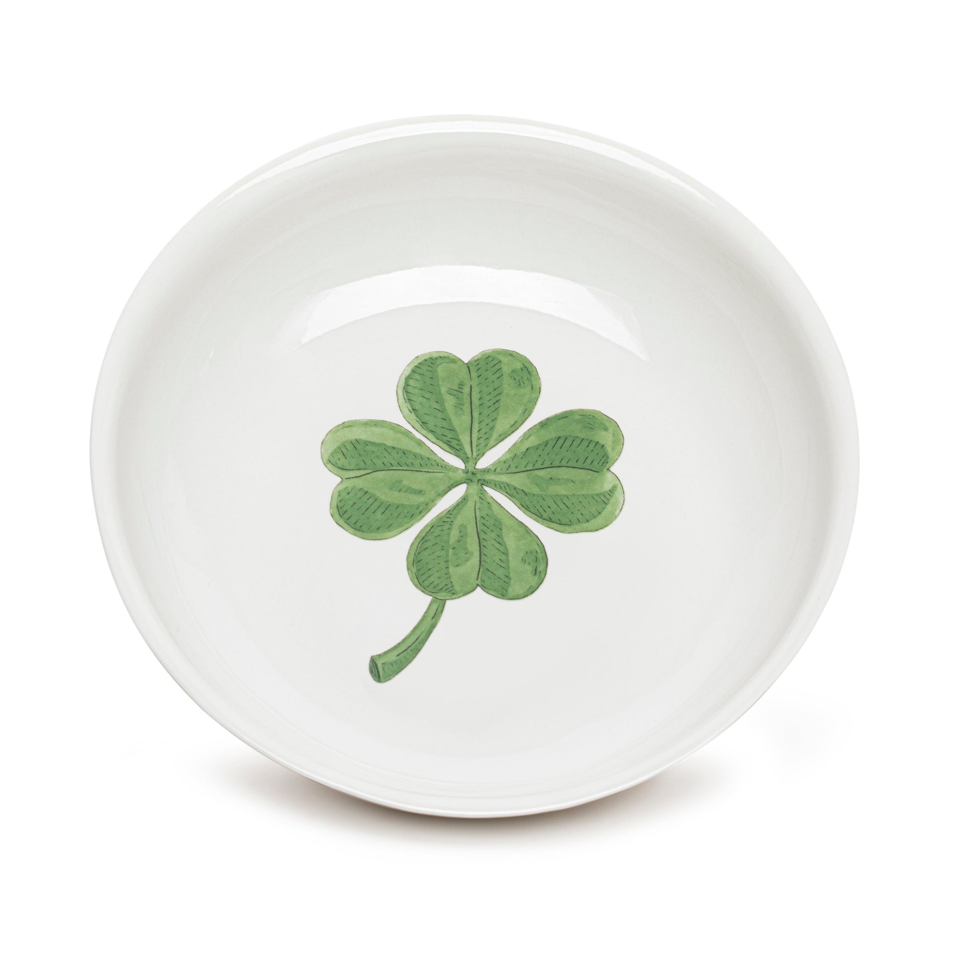 幸運の普遍的なシンボルである四つ葉のクローバーは、伝説によれば、名声、富、愛、健康をもたらします。マリン モンタガットによる象徴的な水彩画、CHANCE が繊細な磁器のスープ プレートに描かれています。