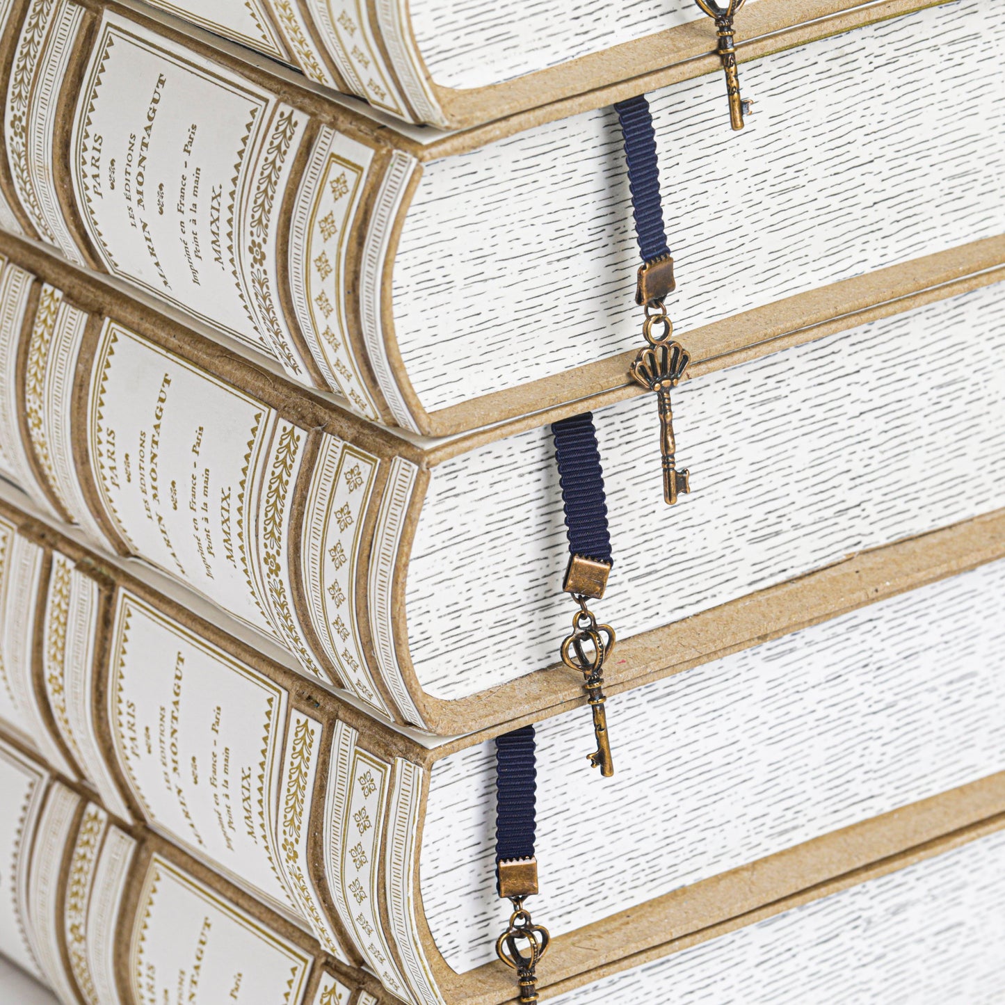 이러한 전통에서 영감을 받아 제작된 "Livres À Secrets" 컬렉션은 파피에마셰(papier-mâché) 기법으로 제작되었으며, 마린 몽타귀(Marin Montagut)의 파리 공방에서 100% 수작업으로 제작, 채색, 그리고 번호가 매겨졌습니다. 내부는 프랑스에서 수작업으로 인쇄된 대리석 무늬 제본지로 안감을 덧대었으며, 끝에 열쇠 모양의 금속 장신구가 달린 리본이 포함되어 있습니다.