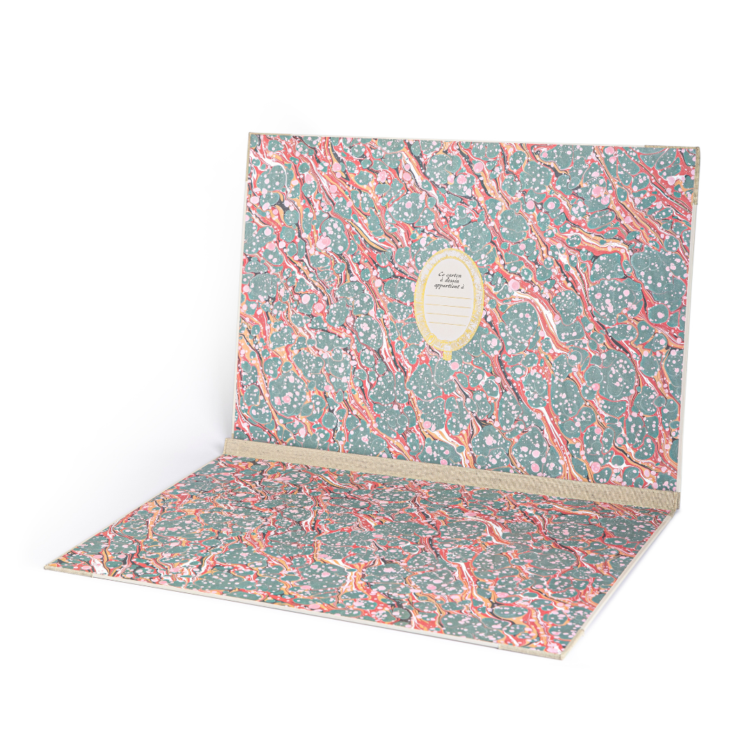 Les deux faces extérieures sont ornées des illustrations de l’artiste, tandis que l’intérieur révèle sa signature : un élégant papier marbré.
